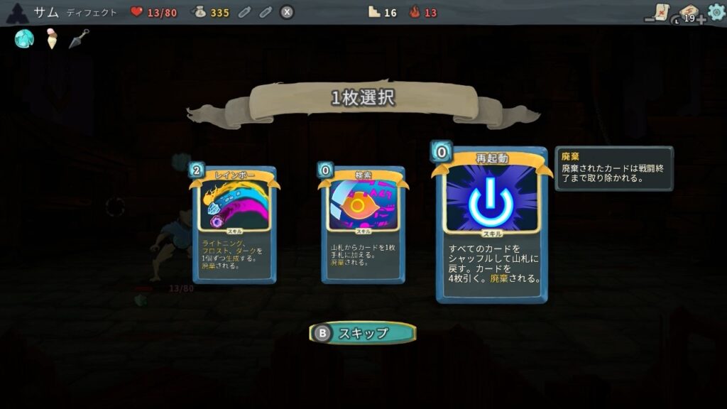 デッキ構築は、ランダムに出てくるカードから選び、デッキを増やしたり減らしたりしながら戦略をたてていくスタイル。